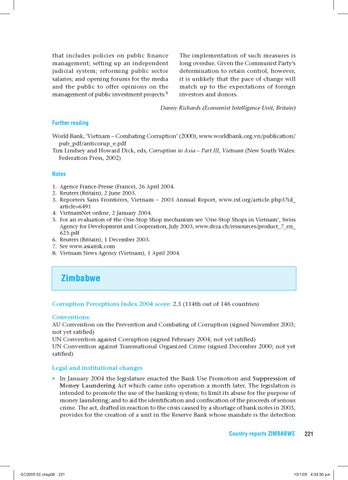 Danny Richards (Economist Intelligence Unit, Britain) Further reading World Bank, ‘Vietnam – Combating Corruption’ (2000), www.worldbank.org.vn/publication/ pub_pdf/anticorup_e.pdf Tim Lindsey and Howard Dick, eds, Corruption in Asia – Part III, Vietnam (New South Wales: Federation Press, 2002) Notes 1. Agence France-Presse (France), 26 April 2004. 2. Reuters (Britain), 2 June 2003. 3. Reporters Sans Frontières, Vietnam – 2003 Annual Report, www.rsf.org/article.php3?id_ article=6491 4. VietnamNet online, 2 January 2004. 5. For an evaluation of the One-Stop Shop mechanism see ‘One-Stop Shops in Vietnam’, Swiss Agency for Development and Cooperation, July 2003, www.deza.ch/ressources/product_7_en_ 625.pdf 6. Reuters (Britain), 1 December 2003. 7. See www.asiarisk.com 8. Vietnam News Agency (Vietnam), 1 April 2004.