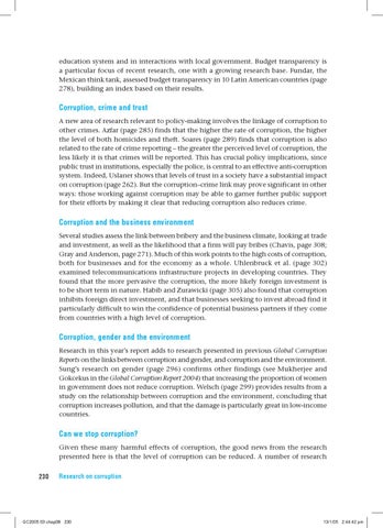 Corruption, gender and the environment Research in this year’s report adds to research presented in previous Global Corruption Reports on the links between corruption and gender, and corruption and the environment. Sung’s research on gender (page 296) confirms other findings (see Mukherjee and Gokcekus in the Global Corruption Report 2004) that increasing the proportion of women in government does not reduce corruption. Welsch (page 299) provides results from a study on the relationship between corruption and the environment, concluding that corruption increases pollution, and that the damage is particularly great in low-income countries.