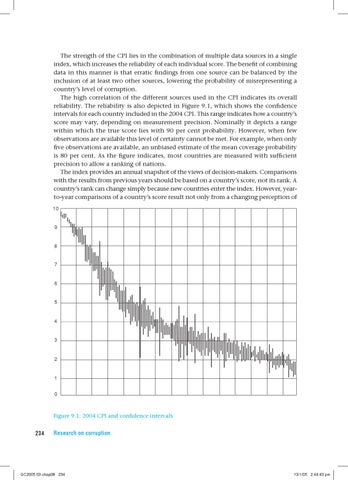 The strength of the CPI lies in the combination of multiple data sources in a single index, which increases the reliability of each individual score. The benefit of combining data in this manner is that erratic findings from one source can be balanced by the inclusion of at least two other sources, lowering the probability of misrepresenting a country’s level of corruption. The high correlation of the different sources used in the CPI indicates its overall reliability. The reliability is also depicted in Figure 9.1, which shows the confidence intervals for each country included in the 2004 CPI. This range indicates how a country’s score may vary, depending on measurement precision. Nominally it depicts a range within which the true score lies with 90 per cent probability. However, when few observations are available this level of certainty cannot be met. For example, when only five observations are available, an unbiased estimate of the mean coverage probability is 80 per cent. As the figure indicates, most countries are measured with sufficient precision to allow a ranking of nations. The index provides an annual snapshot of the views of decision-makers. Comparisons with the results from previous years should be based on a country’s score, not its rank. A country’s rank can change simply because new countries enter the index. However, yearto-year comparisons of a country’s score result not only from a changing perception of �� � � � � � � � � � �