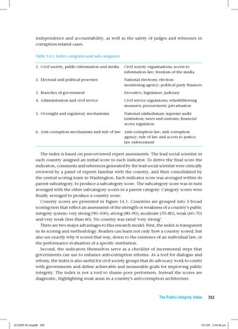 independence and accountability, as well as the safety of judges and witnesses in corruption-related cases. Table 14.1: Index categories and sub-categories 1. Civil society, public information and media