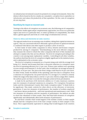 Quantifying the impact on recurrent costs Turning to the effects of corruption on recurrent costs, the following set of comparative econometric studies again adopt complementary approaches: two focus on a particular region and sector at a particular time, to reduce problems of comparability; the third takes a global approach and looks at a wide range of infrastructure services. Water in Africa and electricity in Latin America The regional studies focus on running costs of utilities, taking their capital investment as a given. They are concerned with how efficiently a given amount of capital investment is combined with labour and other inputs to produce a flow of services. In their study of water utility companies in Africa, Estache and Kouassi compare productivity among 21 companies.7 Benchmarking on the most efficient company, they measure the extent to which the other companies fall short of this standard and attempt to explain why they are less efficient. The level of corruption prevailing in the country is one among many explanatory variables. Controlling for all other variables, the authors find that the level of corruption is highly significant in the statistical sense, and is substantial in the economic sense. The level of corruption is measured on a 16-point rising scale with the average level being 10.2. Estache and Kouassi find that a one-point reduction in corruption raises the level of operating efficiency by 6.3 per cent. If these water utilities were operating in non-corrupt environments (1 on the scale), they would have an average increase in efficiency of 64 per cent. The prices the firms charge could thus be 64 per cent lower. In other words, nearly two-thirds of the operating costs were due to corruption. Even a reduction of corruption by one point from the 10.2 average to 9.2 (which is entirely within the range of the data) reduces costs by 6.3 per cent, which is a large effect. Indeed, the authors point out that it exceeds the total gain achieved from privatisation. A study by Bo and Rossi of 80 electricity utilities in 13 Latin American countries uses two measures of national variations in corruption, TI’s Corruption Perceptions Index and the International Country Risk Guide corruption index.8 It finds both to be significant. This study controls for other effects on the efficiency of electricity generation. It uses two measures of performance, the number of workers employed – and hence labour productivity – and total operational and maintenance costs. With two measures of corruption and two measures of performance, the authors are able to check the robustness of their results. They find that both measures of corruption significantly and substantially affect both measures of performance. Bo and Rossi consider what would happen if the median country in their sample (Brazil) had the corruption level of the least corrupt country in their sample (Costa Rica). This is approximately equivalent to asking what would happen if all countries 16