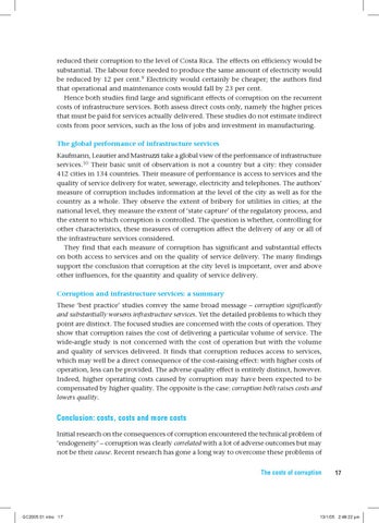 reduced their corruption to the level of Costa Rica. The effects on efficiency would be substantial. The labour force needed to produce the same amount of electricity would be reduced by 12 per cent.9 Electricity would certainly be cheaper; the authors find that operational and maintenance costs would fall by 23 per cent. Hence both studies find large and significant effects of corruption on the recurrent costs of infrastructure services. Both assess direct costs only, namely the higher prices that must be paid for services actually delivered. These studies do not estimate indirect costs from poor services, such as the loss of jobs and investment in manufacturing. The global performance of infrastructure services Kaufmann, Leautier and Mastruzzi take a global view of the performance of infrastructure services.10 Their basic unit of observation is not a country but a city: they consider 412 cities in 134 countries. Their measure of performance is access to services and the quality of service delivery for water, sewerage, electricity and telephones. The authors’ measure of corruption includes information at the level of the city as well as for the country as a whole. They observe the extent of bribery for utilities in cities; at the national level, they measure the extent of ‘state capture’ of the regulatory process, and the extent to which corruption is controlled. The question is whether, controlling for other characteristics, these measures of corruption affect the delivery of any or all of the infrastructure services considered. They find that each measure of corruption has significant and substantial effects on both access to services and on the quality of service delivery. The many findings support the conclusion that corruption at the city level is important, over and above other influences, for the quantity and quality of service delivery. Corruption and infrastructure services: a summary These ‘best practice’ studies convey the same broad message – corruption significantly and substantially worsens infrastructure services. Yet the detailed problems to which they point are distinct. The focused studies are concerned with the costs of operation. They show that corruption raises the cost of delivering a particular volume of service. The wide-angle study is not concerned with the cost of operation but with the volume and quality of services delivered. It finds that corruption reduces access to services, which may well be a direct consequence of the cost-raising effect: with higher costs of operation, less can be provided. The adverse quality effect is entirely distinct, however. Indeed, higher operating costs caused by corruption may have been expected to be compensated by higher quality. The opposite is the case: corruption both raises costs and lowers quality.