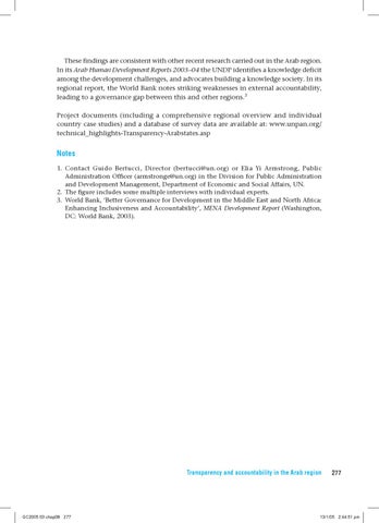 These findings are consistent with other recent research carried out in the Arab region. In its Arab Human Development Reports 2003–04 the UNDP identifies a knowledge deficit among the development challenges, and advocates building a knowledge society. In its regional report, the World Bank notes striking weaknesses in external accountability, leading to a governance gap between this and other regions.3 Project documents (including a comprehensive regional overview and individual country case studies) and a database of survey data are available at: www.unpan.org/ technical_highlights-Transparency-Arabstates.asp