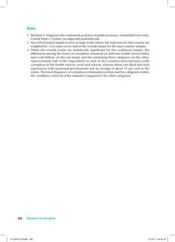 Notes 1. Mitchell A. Seligson is the centennial professor of political science, Vanderbilt University, United States. Contact: m.seligson@vanderbilt.edu 2. Since the Ecuador sample is twice as large as the others, the responses for this country are weighted by .5 in order not to distort the overall means for the nine-country sample. 3. While the overall results are statistically signiďŹ cant for the combined sample, the differences among the forms of corruption measured are between health service bribes and work bribery on the one hand, and the remaining three categories on the other. Approximately half of the respondents in each of the countries had experience with corruption in the health services, work and schools, whereas about one-third had such experiences with municipal governments and an average of about 15 per cent in the courts. The lower frequency of corruption victimisation in these last two categories widens the conďŹ dence interval of the estimates compared to the other categories.