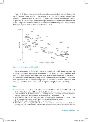Figure 24.2 shows the relationship between homicides and corruption. Improving a country’s corruption score by one standard deviation – from the level of Ukraine to Slovakia, or from the level of Brazil to Cost Rica – would reduce the homicide rate by 50 per cent. For Brazil alone, this would imply a reduction in homicides of more than 10,000 per year. Globally a reduction in homicides of this magnitude would reduce homicides by hundreds of thousands of deaths a year. ���