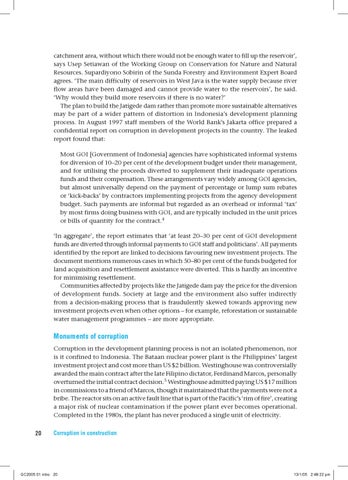 catchment area, without which there would not be enough water to fill up the reservoir’, says Usep Setiawan of the Working Group on Conservation for Nature and Natural Resources. Supardiyono Sobirin of the Sunda Forestry and Environment Expert Board agrees. ‘The main difficulty of reservoirs in West Java is the water supply because river flow areas have been damaged and cannot provide water to the reservoirs’, he said. ‘Why would they build more reservoirs if there is no water?’ The plan to build the Jatigede dam rather than promote more sustainable alternatives may be part of a wider pattern of distortion in Indonesia’s development planning process. In August 1997 staff members of the World Bank’s Jakarta office prepared a confidential report on corruption in development projects in the country. The leaked report found that: Most GOI [Government of Indonesia] agencies have sophisticated informal systems for diversion of 10–20 per cent of the development budget under their management, and for utilising the proceeds diverted to supplement their inadequate operations funds and their compensation. These arrangements vary widely among GOI agencies, but almost universally depend on the payment of percentage or lump sum rebates or ‘kick-backs’ by contractors implementing projects from the agency development budget. Such payments are informal but regarded as an overhead or informal ‘tax’ by most firms doing business with GOI, and are typically included in the unit prices or bills of quantity for the contract.4 ‘In aggregate’, the report estimates that ‘at least 20–30 per cent of GOI development funds are diverted through informal payments to GOI staff and politicians’. All payments identified by the report are linked to decisions favouring new investment projects. The document mentions numerous cases in which 50–80 per cent of the funds budgeted for land acquisition and resettlement assistance were diverted. This is hardly an incentive for minimising resettlement. Communities affected by projects like the Jatigede dam pay the price for the diversion of development funds. Society at large and the environment also suffer indirectly from a decision-making process that is fraudulently skewed towards approving new investment projects even when other options – for example, reforestation or sustainable water management programmes – are more appropriate.