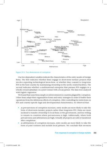 Our two dependent variables indicate the characteristics of the entry modes of foreign firms. The first indicates whether firms engage in short-term turnkey projects that involve exporting technological know-how, or whether they commit to long-term FDI in the host country by maintaining ownership in the newly created facilities. The second indicates whether a multinational enterprise that pursues FDI engages in a wholly-owned subsidiary or a joint venture with a local partner. The data were analysed with logistic regression. We found that some firms simply avoid investment in countries plagued by corruption. Other firms adapt their organisation forms and entry strategies in order to buffer their operations from the deleterious effects of corruption. After controlling for restrictions on FDI and country-specific legal and developmental characteristics, we observed that: • as pervasiveness of corruption increases, entry modes are more likely to take the form of short-term turnkey projects rather than long-term FDI. Firms are more inclined to transfer ownership to local firms or the government, and less willing to remain in countries where pervasiveness is high. Additionally, where both pervasiveness and arbitrariness are high, virtually all projects are sold or transferred after completion • as arbitrariness of corruption increases, entry modes are more likely to take the form of joint ventures and include local partners. We conclude that investors