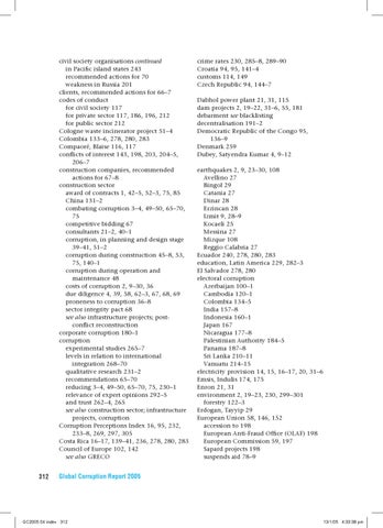 crime rates 230, 285–8, 289–90 Croatia 94, 95, 141–4 customs 114, 149 Czech Republic 94, 144–7 Dabhol power plant 21, 31, 115 dam projects 2, 19–22, 31–6, 55, 181 debarment see blacklisting decentralisation 191–2 Democratic Republic of the Congo 95, 136–9 Denmark 259 Dubey, Satyendra Kumar 4, 9–12 earthquakes 2, 9, 23–30, 108 Avellino 27 Bingol 29 Catania 27 Dinar 28 Erzincan 28 Izmit 9, 28–9 Kocaeli 25 Messina 27 Mizque 108 Reggio Calabria 27 Ecuador 240, 278, 280, 283 education, Latin America 229, 282–3 El Salvador 278, 280 electoral corruption Azerbaijan 100–1 Cambodia 120–1 Colombia 134–5 India 157–8 Indonesia 160–1 Japan 167 Nicaragua 177–8 Palestinian Authority 184–5 Panama 187–8 Sri Lanka 210–11 Vanuatu 214–15 electricity provision 14, 15, 16–17, 20, 31–6 Emsis, Indulis 174, 175 Enron 21, 31 environment 2, 19–23, 230, 299–301 forestry 122–3 Erdogan, Tayyip 29 European Union 58, 146, 152 accession to 198 European Anti-Fraud Office (OLAF) 198 European Commission 59, 197 Sapard projects 198 suspends aid 78–9