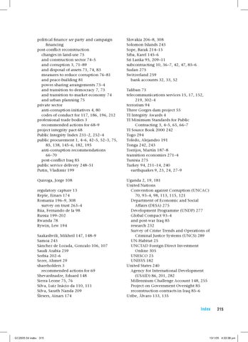 Slovakia 206–8, 308 Solomon Islands 243 Sope, Barak 214–15 Srba, Karel 145–6 Sri Lanka 95, 209–11 subcontracting 10, 36–7, 42, 47, 85–6 Sudan 275 Switzerland 259 bank accounts 32, 33, 52 Taliban 73 telecommunications services 15, 17, 152, 219, 302–4 terrorism 94 Three Gorges dam project 55 TI Integrity Awards 4 TI Minimum Standards for Public Contracting 3, 4–5, 65, 66–7 TI Source Book 2000 242 Togo 294 Toledo, Alejandro 191 Tonga 242, 243 Torrijos, Martín 187–8 transition economies 271–4 Tunisia 275 Turkey 94, 211–14, 240 earthquakes 9, 23, 24, 27–9 Uganda 2, 19, 181 United Nations Convention against Corruption (UNCAC) 70, 93–4, 98, 113, 115, 121 Department of Economic and Social Affairs (DESA) 275 Development Programme (UNDP) 277 Global Compact 93–4 and post-war Iraq 85 research 232 Survey of Crime Trends and Operations of Criminal Justice Systems (UNCS) 289 UN-Habitat 25 UNCTAD Foreign Direct Investment Online 305 UNESCO 25 UNISYS 182 United States 240 Agency for International Development (USAID) 86, 201, 282 Millennium Challenge Account 148, 255 Project on Government Oversight 85 reconstruction contracts in Iraq 85–6 Uribe, Álvaro 133, 135