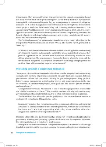 Overcoming corruption in infrastructure development Transparency International has developed tools such as the Integrity Pact for combating corruption in the field of public procurement. Integrity Pacts are contracts between government offices and companies bidding for particular projects. They prohibit bribery, ensure transparency in the bidding process and foresee sanctions in the case of violations. In infrastructure projects, such pacts can also include private investors and consultants.9 ‘Comprehensive Options Assessment’ is one of the strategic priorities proposed by the World Commission on Dams.10 The principle has been officially endorsed by many governments and financial institutions, but is often not implemented in practice. The World Bank has adopted a specific guideline to rule out conflicts of interest in dealing with consultants. This guideline states: Bank policy requires that consultants provide professional, objective and impartial advice and at all times hold the client’s interests paramount, without any consideration for future work, and that in providing advice they avoid conflicts with other assignments and their own corporate interests.11 If strictly adhered to, this guideline would go a long way towards avoiding fraudulent practices in assessing and preparing options of infrastructure development. However, like other guidelines, it is not always implemented. Sunlight is the best disinfectant. Complete transparency is needed to discourage fraudulent practices in the process of assessing the needs and options of infrastructure 22