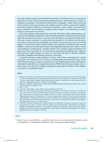 twice this number injured and 200,000 left homeless. The disaster led to a crescendo of opposition towards corrupt and shoddy building practices, spearheaded by a number of outspoken newspapers. Immediately following the earthquake, media outlets launched harsh criticism of the government’s slow disaster response which caused more fatalities as victims waited for assistance in the form of sanitation, water, shelters, and search and rescue. Attention soon focused on corruption and its impact on construction as a direct reason for the massive loss of lives. If the Izmit response represented the worst side of Turkey’s public administration, the response to the Bingol earthquake in 2003 embodied the best. Governmental and military response and search and rescue were both quick and efficient and garnered high praise. The issue of past corruption in construction was brought to the forefront and the press was quick to assert that this earthquake was similar to most previous ones concerning quality of construction. Many political leaders and academics complained and accused builders, contractors and the government of disregarding building codes, quality control and geological considerations. President Ahmet Sezer publicly urged punishment for those who were responsible for constructing the government buildings that collapsed. Prime Minister Tayyip Erdogan was quick to assert that ‘the ideas of stealing materials, corruption, illegalities and injustice [must be corrected]’.4 Corruption remains a major problem in Turkey. A first step in attempting to combat corruption is the admission of its existence, something the government has done under Prime Minister Erdogan, thanks to pressure from the Turkish people whose ambivalence and fatalistic attitudes have changed dramatically. While there has been progress, there is much more to do, however.5 Putting a transparent national plan into effect, with integrity, is crucial for a sustainable Turkey.6 Notes 1. William A. Mitchell is a professor in the political science department, holds the Jo Murphy Chair in International Education, is a Middle East Area specialist, and has lived in Turkey for more than 12 years. Justin Page is a Baylor University graduate student in Middle East international relations and has completed research in Turkey, Iraq and Egypt. 2. William A. Mitchell, The Republic of Turkey and Earthquake Disaster Management (New York: Global Humanities Press, 2004), p. 146. 3. Ibid., p. 156. 4. Quoted in Relief Web, 4 May 2003, www.reliefweb.int/5/4/03 5. After the Izmit earthquake, public education campaigns on dangerous practices in reinforced concrete construction and introducing the basic principle of seismic-resistant construction were carried out in Istanbul by the Istanbul Governor’s Office and Bogazici University’s Disaster Preparedness Education Programme. This latter programme reached 1.5 million school children and hundreds of thousands of parents in four provinces and is now being expanded nationwide with the support of the ministry of education. A network of ombudsmen could also help support the public demand for safe construction. 6. The METU Disaster Management Implementation and Research Center (in conjunction with the government of Turkey – created under the UNDP cost-sharing project ‘Improvement of Turkey’s Disaster Management System’) is an excellent initiative to bring geo-science and social science together to work for a better understanding of social attitudes and citizen participation for disaster preparedness and mitigation in Turkey.