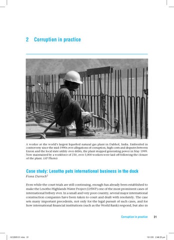 Case study: Lesotho puts international business in the dock Fiona Darroch1 Even while the court trials are still continuing, enough has already been established to make the Lesotho Highlands Water Project (LHWP) one of the most prominent cases of international bribery ever. In a small and very poor country, several major international construction companies have been taken to court and dealt with resolutely. The case sets many important precedents, not only for the legal pursuit of such cases, and for how international ďŹ nancial institutions (such as the World Bank) respond, but also in