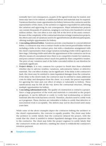 normally have cost consequences, as parts of the agreed work may be wasted, new items may have to be ordered, or additional labour and materials may be required. Variations therefore create opportunities for bribery between the contractor and the representative of the client, or the architect or engineer responsible for authorising the variation and approving its cost consequences. Major infrastructure projects can contain thousands of variations, ranging in cost from a few hundred to several million dollars. The cost effect is not only felt at the level of the main contract. Because of the complexity of the contractual structure in large construction projects, the effects and costs of variations need to be agreed between all affected participants, offering multiple opportunities for bribery. 2. Concealing deferred bribes. Variations provide a mechanism to conceal deferred bribes. A contractor may win a contract tender as the lowest-priced bidder without including a bribe in the contract price, but with a clandestine arrangement with the client’s representative that a large variation including a bribe will be agreed at a later stage. Deferring a bribe until after the appointment of the contractor can be an effective means of concealment since there is no competitive tender for variations, and post-contract variations attract much less publicity than competitive tenders. The price of any variation (and of the bribe concealed within it) can therefore be extremely significant. 3. Project delays. It is very common for a project to finish later than scheduled whether due to adverse weather, variations, subcontractor failure or defective materials. The cost effect of delay can be significant. If the delay is the contractor’s fault, the client may be entitled to claim liquidated damages from the contractor. If the delay is the client’s fault, the contractor may be entitled to claim additional costs for delay and disruption from the client. As a result, the person responsible for agreeing the time and cost effect of delays is vulnerable to bribery. These ramifications may be felt all the way down the contractual structure, offering multiple opportunities for bribery. 4. Concealing substandard work. The quality of construction is central to a project. Since a large proportion of the work and materials is concealed as the project progresses, it can be difficult or costly to verify bad workmanship or inferior materials after the work has been covered. Therefore, checkers need to certify work as it progresses. These checkers are vulnerable to bribes to certify that defective or non-existent work is acceptable. The defects may not be discovered until many years later. While some of the above examples depict the contractor bribing the architect or the client’s representative, the converse is equally possible. The client may bribe the architect to certify falsely that the contractor delayed the project, with the result that the client is entitled to deduct liquidated damages from payments due to the contractor. The client may bribe the project engineer to certify falsely that the contractor’s works are defective, entitling the client to withhold the contractor’s retention payment. 46