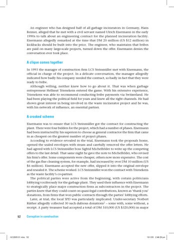 A crooked scheme Eisermann was to ensure that LCS Steinmüller got the contract for constructing the plant. There were four bidders for the project, which had a number of phases. Eisermann had been instructed by his superiors to choose as general contractor the firm that came in as cheapest on the greatest number of project phases. According to evidence revealed in the trial, Eisermann took the proposals home, opened the sealed envelopes with steam and carefully removed the offer letters. He had agreed with LCS Steinmüller boss Sigfrid Michelfelder to write up the competing offers to the last detail. That same night he gave the note to Michelfelder, who revised his firm’s offer. Some components were cheaper, others now more expensive. The cost of the gas flue cleaning system, for example, had increased by over DM 10 million (US $6 million). Eisermann accepted the new offer, slipped it into the original envelope and resealed it. The scheme worked. LCS Steinmüller won the contract with Trienekens as the waste facility’s co-partner. The political parties were active from the beginning, with certain politicians lobbying vociferously for the garbage plant. They used their influence with Eisermann to strategically place major construction firms as subcontractors in the project. The parties knew that they could count on quasi-legal contributions, known as ‘thank you’ donations, from firms that won public contracts through the parties’ lobbying efforts. Later, at trial, the local SPD was particularly implicated. Under-secretary Norbert Rüther allegedly collected 30 such dubious donations2 – some with, some without, a receipt. A party treasurer had accepted a total of DM 510,000 (US $320,000) in major 52