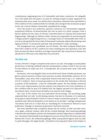 The bitter end In May 2004 the Cologne corruption trial came to an end. Trial judges accused public prosecutors of having withheld relevant documentary evidence until it was too late for the defence to make use of it. Consequently, the accused came away with mild sentences. Eisermann, who was alleged to have received the lion’s share of bribe payments, was given a prison sentence of three years and nine months. Michelfelder, director of LCS Steinmüller, came away with a suspended sentence but had to pay a €1 million fine (US $1.2 million). There is broad speculation in the media that Trienekens collected a portion of the kickbacks – a fact he vehemently denies. He was initially sentenced to two years’ imprisonment, but the sentence was reduced to two years’ probation on the condition that he post €10 million bail, the highest amount ever imposed for a tax-related crime. Social Democrat Rüther was cleared of all charges. The crux of the matter was not individual shortcomings. The presiding judge explained that not only ‘in developing nations, but also in Germany, it is customary for people to help themselves when it comes to major construction projects’. Council members had ‘allowed themselves to be drawn in on all sides’. Garbage entrepreneur Trienekens had seen to it that that an ‘unending list of donations’ flowed to local politicians. Damage of ‘immense proportions’ had been incurred. The story illustrates that corruption always has its victims. In this case they were, once again, ordinary citizens: after all the crooked dealings, their municipal garbage collection fees had tripled, and the city had landed a facility larger than it could possibly use. The project had initially been designed to process around 400,000 tonnes per year. Behind the scenes, the influential garbage lobby manipulated figures and was able to push through a far larger facility. Trienekens even imported refuse from Naples in Corruption in practice