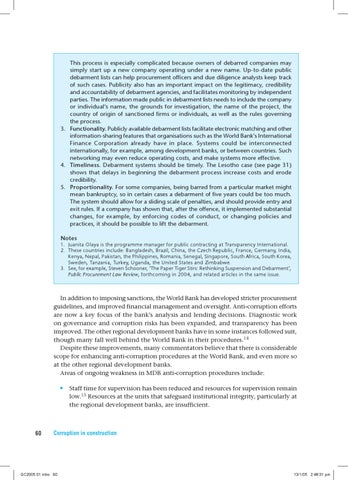 This process is especially complicated because owners of debarred companies may simply start up a new company operating under a new name. Up-to-date public debarment lists can help procurement officers and due diligence analysts keep track of such cases. Publicity also has an important impact on the legitimacy, credibility and accountability of debarment agencies, and facilitates monitoring by independent parties. The information made public in debarment lists needs to include the company or individual’s name, the grounds for investigation, the name of the project, the country of origin of sanctioned firms or individuals, as well as the rules governing the process. 3. Functionality. Publicly available debarment lists facilitate electronic matching and other information-sharing features that organisations such as the World Bank’s International Finance Corporation already have in place. Systems could be interconnected internationally, for example, among development banks, or between countries. Such networking may even reduce operating costs, and make systems more effective. 4. Timeliness. Debarment systems should be timely. The Lesotho case (see page 31) shows that delays in beginning the debarment process increase costs and erode credibility. 5. Proportionality. For some companies, being barred from a particular market might mean bankruptcy, so in certain cases a debarment of five years could be too much. The system should allow for a sliding scale of penalties, and should provide entry and exit rules. If a company has shown that, after the offence, it implemented substantial changes, for example, by enforcing codes of conduct, or changing policies and practices, it should be possible to lift the debarment. Notes