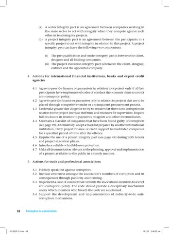 4. Actions for international financial institutions, banks and export credit agencies 4.1 Agree to provide finance or guarantees in relation to a project only if all key participants have implemented codes of conduct that commit them to a strict anti-corruption policy. 4.2 Agree to provide finance or guarantees only in relation to projects that are to be placed through competitive tender or a transparent procurement process. 4.3 Undertake greater due diligence to try to ensure that there is no corruption in relation to the project. Increase staff time and resources for supervision. Require full disclosure in relation to payments to agents and other intermediaries. 4.4 Maintain a blacklist of companies that have been found guilty of corruption (see page 59). Alternatively, adopt a blacklist prepared by another international institution. Deny project finance or credit support to blacklisted companies for a specified period of time after the offence. 4.5 Require the use of a project integrity pact (see page 49) during both tender and project execution phases. 4.6 Introduce reliable whistleblower protection. 4.7 Make all documentation relevant to the planning, approval and implementation of a project available to the public in a timely manner. 5. Actions for trade and professional associations 5.1 Publicly speak out against corruption. 5.2 Increase awareness amongst the association’s members of corruption and its consequences through publicity and training. 5.3 Implement a code of conduct that commits the association’s members to a strict anti-corruption policy. The code should provide a disciplinary mechanism under which members who breach the code are sanctioned. 5.4 Support the development and implementation of industry-wide anticorruption mechanisms.