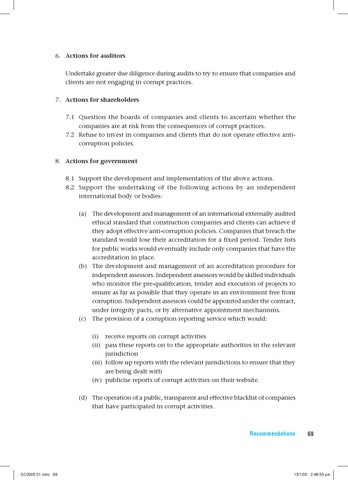 6. Actions for auditors Undertake greater due diligence during audits to try to ensure that companies and clients are not engaging in corrupt practices. 7. Actions for shareholders 7.1 Question the boards of companies and clients to ascertain whether the companies are at risk from the consequences of corrupt practices. 7.2 Refuse to invest in companies and clients that do not operate effective anticorruption policies. 8. Actions for government 8.1 Support the development and implementation of the above actions. 8.2 Support the undertaking of the following actions by an independent international body or bodies: (a) The development and management of an international externally audited ethical standard that construction companies and clients can achieve if they adopt effective anti-corruption policies. Companies that breach the standard would lose their accreditation for a fixed period. Tender lists for public works would eventually include only companies that have the accreditation in place. (b) The development and management of an accreditation procedure for independent assessors. Independent assessors would be skilled individuals who monitor the pre-qualification, tender and execution of projects to ensure as far as possible that they operate in an environment free from corruption. Independent assessors could be appointed under the contract, under integrity pacts, or by alternative appointment mechanisms. (c) The provision of a corruption reporting service which would: (i) receive reports on corrupt activities (ii) pass these reports on to the appropriate authorities in the relevant jurisdiction (iii) follow up reports with the relevant jurisdictions to ensure that they are being dealt with (iv) publicise reports of corrupt activities on their website. (d) The operation of a public, transparent and effective blacklist of companies that have participated in corrupt activities.
