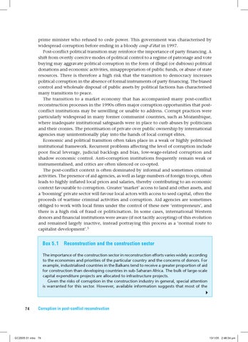 prime minister who refused to cede power. This government was characterised by widespread corruption before ending in a bloody coup d’état in 1997. Post-conflict political transition may reinforce the importance of party financing. A shift from overtly coercive modes of political control to a regime of patronage and vote buying may aggravate political corruption in the form of illegal (or dubious) political donations and economic activities, misappropriation of public funds, or abuse of state resources. There is therefore a high risk that the transition to democracy increases political corruption in the absence of formal instruments of party financing. The biased control and wholesale disposal of public assets by political factions has characterised many transitions to peace. The transition to a market economy that has accompanied many post-conflict reconstruction processes in the 1990s offers major corruption opportunities that postconflict institutions may be unwilling or unable to address. Corrupt practices were particularly widespread in many former communist countries, such as Mozambique, where inadequate institutional safeguards were in place to curb abuses by politicians and their cronies. The prioritisation of private over public ownership by international agencies may unintentionally play into the hands of local corrupt elites. Economic and political transition often takes place in a weak or highly politicised institutional framework. Recurrent problems affecting the level of corruption include poor fiscal leverage, judicial backlogs and bias, low-wage-related corruption and shadow economic control. Anti-corruption institutions frequently remain weak or instrumentalised, and critics are often silenced or co-opted. The post-conflict context is often dominated by informal and sometimes criminal activities. The presence of aid agencies, as well as large numbers of foreign troops, often leads to highly inflated local prices and salaries, thereby contributing to an economic context favourable to corruption. Greater ‘market’ access to land and other assets, and a ‘booming’ private sector will favour local actors with access to seed capital, often the proceeds of wartime criminal activities and corruption. Aid agencies are sometimes obliged to work with local firms under the control of these new ‘entrepreneurs’, and there is a high risk of fraud or politicisation. In some cases, international Western donors and financial institutions were aware (if not tacitly accepting) of this evolution and remained largely inactive, instead portraying this process as a ‘normal route to capitalist development’.5