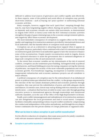 difficult to address local sources of grievances and conflict rapidly and effectively. In these respects, some of the political and social effects of corruption may provide short-term solutions – such as buying out ‘peace spoilers’ or authorising informal economic activities. Many examples, however, suggest that such ‘quick fixes’, tempting though they may be, may have long-lasting negative effects. Buying out spoilers is a risky venture, as impunity and economic rewards can sustain rebel movements, as demonstrated in Angola with UNITA or Sierra Leone with the RUF. Informal economic activities strengthen the grip of quasi-criminal groups in the economic and government spheres, and negatively affect future economic development. The most immediate consequence of corruption is a negative effect on the volume, quality and targeting of reconstruction assistance provided by international donors and local authorities. But the harmful effects of corruption reach much further. Corruption can act as a deterrent to attracting donor support when it appears in local public finances, particularly when combined with a lack of commitment towards reconstruction goals and where local authorities appear to have the resources to finance some of the reconstruction. Despite massive reconstruction needs in Angola, donors have expressed reluctance to assist the government due to sustained allegations of large-scale corruption in this oil and mineral-rich country. To the extent that economic variables are key determinants of the risk of renewed conflicts, corruption can also undermine peace building. Aid targeted solely at political constituencies, and biased bidding processes favouring companies serving the interests of politicians, can impair the security of the most vulnerable populations and overall economic growth. Poor beneficiary targeting, incompetent or wasteful contractors, inappropriate infrastructure and economic assistance projects can all contribute to major setbacks. A political consequence of corruption may be the entrenchment of an imbalanced power or political status quo inherited from the conflict. As the groups empowered by the outcome of the war sustain dominant political and economic positions through corruption, they may prevent the redistribution of power, and stifle adequate checks and balances. In extreme cases, donors may end up dealing with war criminals as official interlocutors – a situation that has been avoided in some cases only through granting executive powers to international agencies through trusteeships and transitional authority mandates, as in the case of the Office of the High Representative in Bosnia. Finally, post-conflict mismanagement and embezzlement of reconstruction assistance can also delegitimise the local government and lead to social unrest. Corruption facilitates criminality and persisting violence in post-conflict societies by compromising the conduct and independence of the police and judiciary, and through the recycling of former combatants into the private militias of corrupt politicians or organised crime.