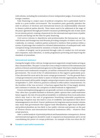 with reforms, including the nomination of more independent judges, if necessary from foreign countries. Party financing is a major cause of political corruption, but is particularly hard to tackle in a post-conflict environment. The incumbent party generally plunders the state in advance of elections and international donors are understandably reluctant to finance political parties directly. These issues need to be addressed at the stage of the peace agreement through preventative measures prohibiting the sale of state assets for an interim period, creating a framework for the international supervision of public accounts and laying out the rules for party financing. Civil service reforms to depoliticise and professionalise the bureaucracy are key, with Bosnia and Herzegovina and Rwanda providing examples of relative success.8 In Cambodia, in contrast, coalition parties jockeyed to reinforce their position within a system of patronage that resulted in a bloated administration of underpaid staff, with corruption being orchestrated by ministers or heads of department. A culture of integrity can be promoted through codes of conduct for civil servants and companies, mass education, or media programmes protecting and improving the standards of journalism. International assistance During the height of the cold war, foreign sponsors supported corrupt leaders as long as they remained allies. The past 15 years have seen a sharp evolution in the statements and policies of donors and international agencies in this regard. Most have emphasised good governance and condemned corruption, yet aid has continued to be allocated to corrupt governments. The record of the US administration in this regard is particularly poor: it has allocated the most aid to the most corrupt governments.9 On the grounds that a corrupt government is more likely to assist or tolerate terrorist organisations, there has been an increased call for public integrity and good governance since the terrorist attacks of September 11, 2001. However, practices continue to reflect ad hoc vested interests. On the frontline of the ‘war on terror’, it has been argued that the US has largely abetted, and continues to tolerate, the corruption of allied warlords in Afghanistan.10 Donors and implementing agencies are generally not keen on denouncing corruption. They often fear a possible backlash in domestic public opinion that could undermine future support, the risk of local political instability or retribution from local authorities which may lead to the end of programmes benefiting vulnerable populations. Exposing corruption may also lead to a loss of credibility and reputation when direct mismanagement is involved. Donors’ preferences for long-term macroeconomic reforms may mean that governments that support trade liberalisation, tight fiscal discipline and political pluralism are less likely to face public criticism and pressure on the part of Western donors and International Financial Institutions (IFIs) – whatever their actual practices. After a careful analysis of potential political and humanitarian consequences, donors and international agencies should be ready to suspend non-humanitarian aid to avoid consolidating the power of corrupt politicians. An example of this was when the EU 78