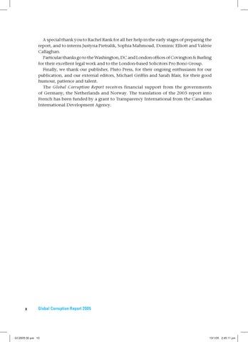 A special thank you to Rachel Rank for all her help in the early stages of preparing the report, and to interns Justyna Pietralik, Sophia Mahmoud, Dominic Elliott and ValĂŠrie Callaghan. Particular thanks go to the Washington, DC and London offices of Covington & Burling for their excellent legal work and to the London-based Solicitors Pro Bono Group. Finally, we thank our publisher, Pluto Press, for their ongoing enthusiasm for our publication, and our external editors, Michael Griffin and Sarah Blair, for their good humour, patience and talent. The Global Corruption Report receives financial support from the governments of Germany, the Netherlands and Norway. The translation of the 2005 report into French has been funded by a grant to Transparency International from the Canadian International Development Agency.