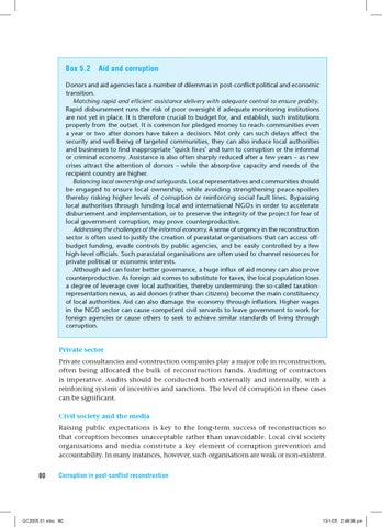 Private sector Private consultancies and construction companies play a major role in reconstruction, often being allocated the bulk of reconstruction funds. Auditing of contractors is imperative. Audits should be conducted both externally and internally, with a reinforcing system of incentives and sanctions. The level of corruption in these cases can be significant. Civil society and the media Raising public expectations is key to the long-term success of reconstruction so that corruption becomes unacceptable rather than unavoidable. Local civil society organisations and media constitute a key element of corruption prevention and accountability. In many instances, however, such organisations are weak or non-existent. 80