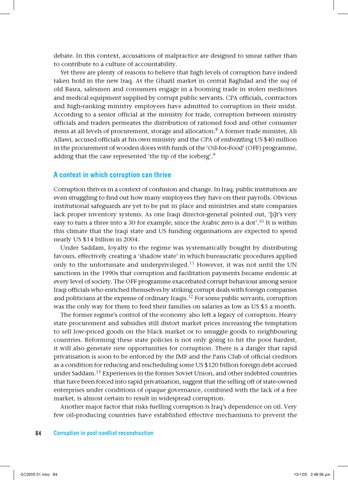 A context in which corruption can thrive Corruption thrives in a context of confusion and change. In Iraq, public institutions are even struggling to find out how many employees they have on their payrolls. Obvious institutional safeguards are yet to be put in place and ministries and state companies lack proper inventory systems. As one Iraqi director-general pointed out, ‘[i]t’s very easy to turn a three into a 30 for example, since the Arabic zero is a dot’.10 It is within this climate that the Iraqi state and US funding organisations are expected to spend nearly US $14 billion in 2004. Under Saddam, loyalty to the regime was systematically bought by distributing favours, effectively creating a ‘shadow state’ in which bureaucratic procedures applied only to the unfortunate and underprivileged.11 However, it was not until the UN sanctions in the 1990s that corruption and facilitation payments became endemic at every level of society. The OFF programme exacerbated corrupt behaviour among senior Iraqi officials who enriched themselves by striking corrupt deals with foreign companies and politicians at the expense of ordinary Iraqis.12 For some public servants, corruption was the only way for them to feed their families on salaries as low as US $5 a month. The former regime’s control of the economy also left a legacy of corruption. Heavy state procurement and subsidies still distort market prices increasing the temptation to sell low-priced goods on the black market or to smuggle goods to neighbouring countries. Reforming these state policies is not only going to hit the poor hardest, it will also generate new opportunities for corruption. There is a danger that rapid privatisation is soon to be enforced by the IMF and the Paris Club of official creditors as a condition for reducing and rescheduling some US $120 billion foreign debt accrued under Saddam.13 Experiences in the former Soviet Union, and other indebted countries that have been forced into rapid privatisation, suggest that the selling off of state-owned enterprises under conditions of opaque governance, combined with the lack of a free market, is almost certain to result in widespread corruption. Another major factor that risks fuelling corruption is Iraq’s dependence on oil. Very few oil-producing countries have established effective mechanisms to prevent the 84