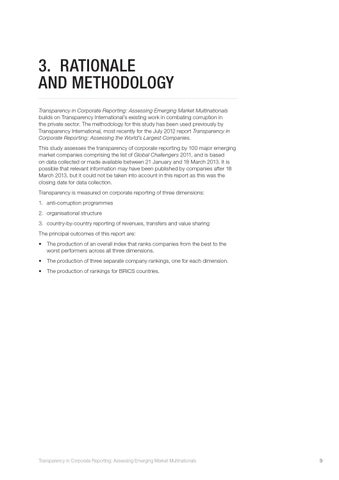 3. RATIONALE AND METHODOLOGY Transparency in Corporate Reporting: Assessing Emerging Market Multinationals builds on Transparency International’s existing work in combating corruption in the private sector. The methodology for this study has been used previously by Transparency International, most recently for the July 2012 report Transparency in Corporate Reporting: Assessing the World’s Largest Companies. This study assesses the transparency of corporate reporting by 100 major emerging market companies comprising the list of Global Challengers 2011, and is based on data collected or made available between 21 January and 18 March 2013. It is possible that relevant information may have been published by companies after 18 March 2013, but it could not be taken into account in this report as this was the closing date for data collection. Transparency is measured on corporate reporting of three dimensions: 1. anti-corruption programmes 2. organisational structure 3. country-by-country reporting of revenues, transfers and value sharing The principal outcomes of this report are: • The production of an overall index that ranks companies from the best to the worst performers across all three dimensions. • The production of three separate company rankings, one for each dimension. • The production of rankings for BRICS countries.