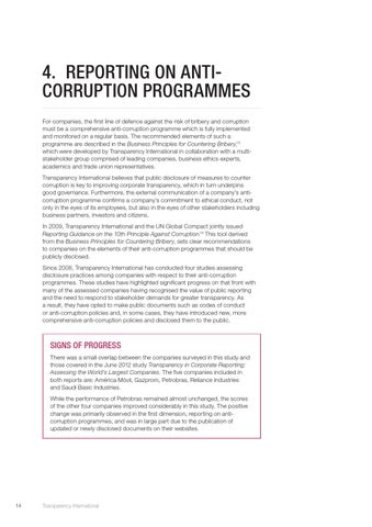 4. REPORTING ON ANTICORRUPTION PROGRAMMES For companies, the first line of defence against the risk of bribery and corruption must be a comprehensive anti-corruption programme which is fully implemented and monitored on a regular basis. The recommended elements of such a programme are described in the Business Principles for Countering Bribery,13 which were developed by Transparency International in collaboration with a multistakeholder group comprised of leading companies, business ethics experts, academics and trade union representatives. Transparency International believes that public disclosure of measures to counter corruption is key to improving corporate transparency, which in turn underpins good governance. Furthermore, the external communication of a company’s anticorruption programme confirms a company’s commitment to ethical conduct, not only in the eyes of its employees, but also in the eyes of other stakeholders including business partners, investors and citizens. In 2009, Transparency International and the UN Global Compact jointly issued Reporting Guidance on the 10th Principle Against Corruption.14 This tool derived from the Business Principles for Countering Bribery, sets clear recommendations to companies on the elements of their anti-corruption programmes that should be publicly disclosed. Since 2008, Transparency International has conducted four studies assessing disclosure practices among companies with respect to their anti-corruption programmes. These studies have highlighted significant progress on that front with many of the assessed companies having recognised the value of public reporting and the need to respond to stakeholder demands for greater transparency. As a result, they have opted to make public documents such as codes of conduct or anti-corruption policies and, in some cases, they have introduced new, more comprehensive anti-corruption policies and disclosed them to the public.