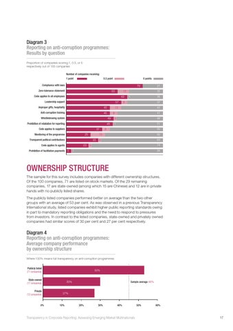 OWNERSHIP STRUCTURE The sample for this survey includes companies with different ownership structures. Of the 100 companies, 71 are listed on stock markets. Of the 29 remaining companies, 17 are state-owned (among which 15 are Chinese) and 12 are in private hands with no publicly listed shares. The publicly listed companies performed better on average than the two other groups with an average of 53 per cent. As was observed in a previous Transparency International study, listed companies exhibit higher public reporting standards owing in part to mandatory reporting obligations and the need to respond to pressures from investors. In contrast to the listed companies, state-owned and privately owned companies had similar scores of 30 per cent and 27 per cent respectively.
