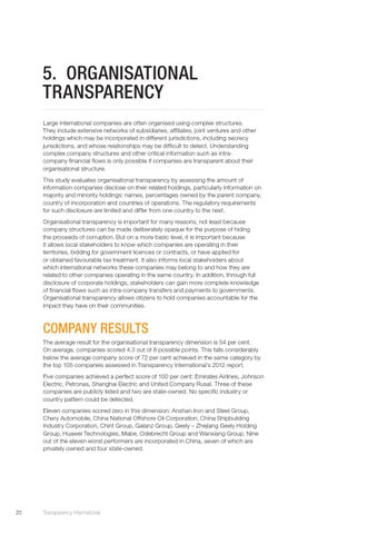 5. ORGANISATIONAL TRANSPARENCY Large international companies are often organised using complex structures. They include extensive networks of subsidiaries, affiliates, joint ventures and other holdings which may be incorporated in different jurisdictions, including secrecy jurisdictions, and whose relationships may be difficult to detect. Understanding complex company structures and other critical information such as intracompany financial flows is only possible if companies are transparent about their organisational structure. This study evaluates organisational transparency by assessing the amount of information companies disclose on their related holdings, particularly information on majority and minority holdings: names, percentages owned by the parent company, country of incorporation and countries of operations. The regulatory requirements for such disclosure are limited and differ from one country to the next. Organisational transparency is important for many reasons, not least because company structures can be made deliberately opaque for the purpose of hiding the proceeds of corruption. But on a more basic level, it is important because it allows local stakeholders to know which companies are operating in their territories, bidding for government licences or contracts, or have applied for or obtained favourable tax treatment. It also informs local stakeholders about which international networks these companies may belong to and how they are related to other companies operating in the same country. In addition, through full disclosure of corporate holdings, stakeholders can gain more complete knowledge of financial flows such as intra-company transfers and payments to governments. Organisational transparency allows citizens to hold companies accountable for the impact they have on their communities.