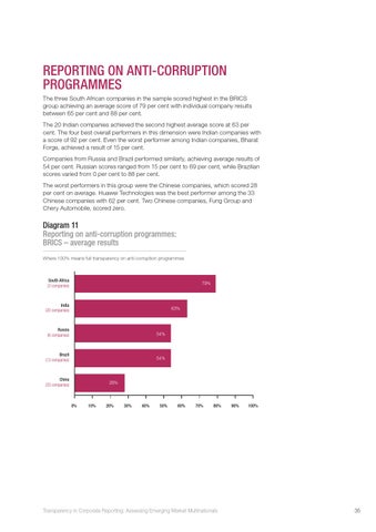REPORTING ON ANTI-CORRUPTION PROGRAMMES The three South African companies in the sample scored highest in the BRICS group achieving an average score of 79 per cent with individual company results between 65 per cent and 88 per cent. The 20 Indian companies achieved the second highest average score at 63 per cent. The four best overall performers in this dimension were Indian companies with a score of 92 per cent. Even the worst performer among Indian companies, Bharat Forge, achieved a result of 15 per cent. Companies from Russia and Brazil performed similarly, achieving average results of 54 per cent. Russian scores ranged from 15 per cent to 69 per cent, while Brazilian scores varied from 0 per cent to 88 per cent. The worst performers in this group were the Chinese companies, which scored 28 per cent on average. Huawei Technologies was the best performer among the 33 Chinese companies with 62 per cent. Two Chinese companies, Fung Group and Chery Automobile, scored zero.
