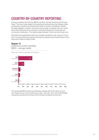 COUNTRY-BY-COUNTRY REPORTING Among companies from the five BRICS countries, the best performing by far were Indian. This was mostly related to the previously mentioned law that requires Indian companies to disclose key financial information for all their subsidiaries. Despite this legal obligation, however, the results among Indian companies still vary, mostly due to their performance on voluntary country-level disclosure of revenues and community contributions. The results ranged between 10 per cent and 34 per cent. Also performing significantly better than average was Russia, with a result of 12 per cent. The best performing among the Russian companies were Norilsk Nickel, Evraz Group and United Company Rusal.