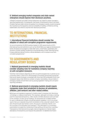 TO GOVERNMENTS AND REGULATORY BODIES 1. National governments in emerging markets should consider adopting rules for mandatory company reporting on anti-corruption measures. Currently most company reporting on anti-corruption programmes is carried out on a voluntary basis. In April 2013, the European Commission announced a proposal that would require European companies with more than 500 employees to be more transparent about their efforts to combat corruption and bribery. Governments in emerging markets should follow suit by passing legislation making anti-corruption reporting mandatory.