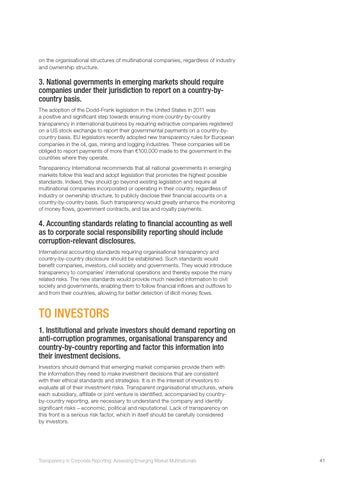 TO INVESTORS 1. Institutional and private investors should demand reporting on anti-corruption programmes, organisational transparency and country-by-country reporting and factor this information into their investment decisions. Investors should demand that emerging market companies provide them with the information they need to make investment decisions that are consistent with their ethical standards and strategies. It is in the interest of investors to evaluate all of their investment risks. Transparent organisational structures, where each subsidiary, affiliate or joint venture is identified, accompanied by countryby-country reporting, are necessary to understand the company and identify significant risks – economic, political and reputational. Lack of transparency on this front is a serious risk factor, which in itself should be carefully considered by investors.
