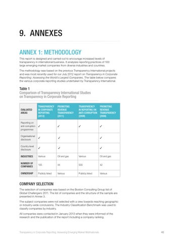 9. ANNEXES ANNEX 1: METHODOLOGY This report is designed and carried out to encourage increased levels of transparency in international business. It analyses reporting practices of 100 large emerging market companies from diverse industries and countries. The methodology was based on the previous Transparency International projects and was most recently used for our July 2012 report on Transparency in Corporate Reporting: Assessing the World’s Largest Companies. The table below compares the various corporate reporting studies undertaken by Transparency International.