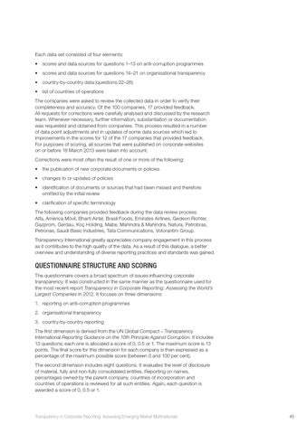 Each data set consisted of four elements: • scores and data sources for questions 1–13 on anti-corruption programmes • scores and data sources for questions 14–21 on organisational transparency • country-by-country data (questions 22–26) • list of countries of operations The companies were asked to review the collected data in order to verify their completeness and accuracy. Of the 100 companies, 17 provided feedback. All requests for corrections were carefully analysed and discussed by the research team. Whenever necessary, further information, substantiation or documentation was requested and obtained from companies. This process resulted in a number of data point adjustments and in updates of some data sources which led to improvements in the scores for 12 of the 17 companies that provided feedback. For purposes of scoring, all sources that were published on corporate websites on or before 18 March 2013 were taken into account. Corrections were most often the result of one or more of the following: • the publication of new corporate documents or policies • changes to or updates of policies • identification of documents or sources that had been missed and therefore omitted by the initial review • clarification of specific terminology The following companies provided feedback during the data review process: Alfa, América Móvil, Bharti Airtel, Brasil Foods, Emirates Airlines, Gedeon Richter, Gazprom, Gerdau, Koç Holding, Mabe, Mahindra & Mahindra, Natura, Petrobras, Petronas, Saudi Basic Industries, Tata Communications, Votorantim Group. Transparency International greatly appreciates company engagement in this process as it contributes to the high quality of the data. As a result of this dialogue, a better overview and understanding of diverse reporting practices and standards was gained.