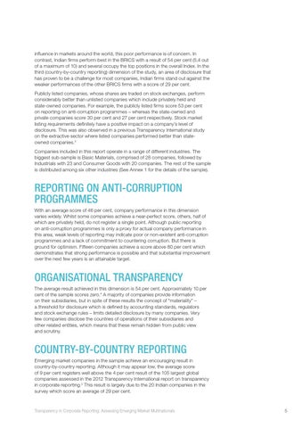 COUNTRY-BY-COUNTRY REPORTING Emerging market companies in the sample achieve an encouraging result in country-by-country reporting. Although it may appear low, the average score of 9 per cent registers well above the 4 per cent result of the 105 largest global companies assessed in the 2012 Transparency International report on transparency in corporate reporting.5 This result is largely due to the 20 Indian companies in the survey which score an average of 29 per cent.