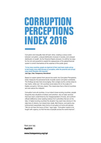 Corruption Perceptions Index 2016 Corruption and inequality feed off each other, creating a vicious circle between corruption, unequal distribution of power in society, and unequal distribution of wealth. As the Panama Papers showed, it is still far too easy for the rich and powerful to exploit the opaqueness of the global financial system to enrich themselves at the expense of the public good. “In too many countries, people are deprived of their most basic needs and go to bed hungry every night because of corruption, while the powerful and corrupt enjoy lavish lifestyles with impunity.” José Ugaz, Chair, Transparency International Based on expert opinion from around the world, the Corruption Perceptions Index measures the perceived levels of public sector corruption worldwide. The findings are less than encouraging. Not a single country comes close to top marks, while over 120 countries score below 50 on the scale of 0 (highly corrupt) to 100 (very clean). This means less than a third of countries are even above the midpoint. Corruption hurts all countries. In our index’s lower-scoring countries, people frequently face situations of bribery and extortion, rely on basic services that have been undermined by the misappropriation of funds, and confront official indifference when seeking redress from authorities that are on the take. In higher-scoring countries the situation may seem less obvious in the daily lives of citizens, but closed-door deals, illicit finance, and patchy law enforcement exacerbate many forms of corruption at home and abroad. “We do not have the luxury of time,” says Ugaz. “Corruption needs to be fought with urgency, so that the lives of people across the world improve”.