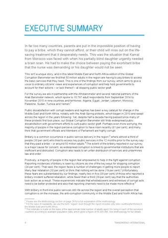 EXECUTIVE SUMMARY In far too many countries, parents are put in the impossible position of having to pay a bribe, which they cannot afford, or their child will miss out on the lifesaving treatment that it desperately needs. This was the situation that Kamal from Morocco was faced with when his partially blind daughter urgently needed a brain scan. He had to make the choice between paying the exorbitant bribe that the nurse was demanding or his daughter would not be seen. This isn't a unique story, and in this latest Middle East and North Africa edition of the Global Corruption Barometer we find that 50 million adults in the region are having to pay bribes to access the basic services that they need. This is one of the findings from our survey, which aims to give a voice to ordinary citizens' views and experiences of corruption and help hold governments to account for their actions – or lack thereof – at stopping public sector graft. For the survey we are in partnership with the Afrobarometer and several national partners of the Arab Barometer network, which spoke to 10,797 adult respondents from September 2014 to November 2015 in nine countries and territories: Algeria, Egypt, Jordan, Lebanon, Morocco, Palestine, Sudan, Tunisia and Yemen.1 Public dissatisfaction with corrupt leaders and regimes has been a key catalyst for change in the Middle East and North Africa, notably with the Arab Spring protests, which began in 2010 and swept across the region in the years following. Yet, despite half a decade having passed since many of these protests first took place, our Global Corruption Barometer still finds widespread public dissatisfaction with government efforts to curb public sector graft. Perhaps even more worrying, the majority of people in the region perceive corruption to have risen recently (61 per cent), and many think that government officials and Members of Parliament are highly corrupt. Bribery is a common occurrence in public service delivery in the region,2 where almost a third of people (30 per cent) who tried to access key public services in the 12 months prior to the survey say that they paid a bribe – or around 50 million adults.3 The extent of the bribery reported in our survey is a major cause for concern, as widespread corruption is linked to governmental institutions that are inefficient and distrusted. Corruption also leads to an unfair distribution of services and undermines law and order. Positively, a majority of people in the region feel empowered to help in the fight against corruption. Reporting incidences of bribery is seen by citizens as one of the key ways for stopping corruption (24 per cent). That said, the region faces a number of challenges in getting more people to report. Many fear retaliation (30 per cent) or think that nothing will be done (19 per cent).i Unfortunately these fears are substantiated by our findings: nearly two in five (38 per cent) of those who reported a bribery incident suffered retaliation, while fewer than a third (29 per cent) say that the authorities took action as a result. These experiences indicate that whistleblowers and witnesses of corrupt acts need to be better protected and also that reporting channels need to be made more effective.ii With bribery in front-line public services still rife across the region and the overall perception that corruption is on the increase, the anti-corruption community in the Middle East and North Africa has 1