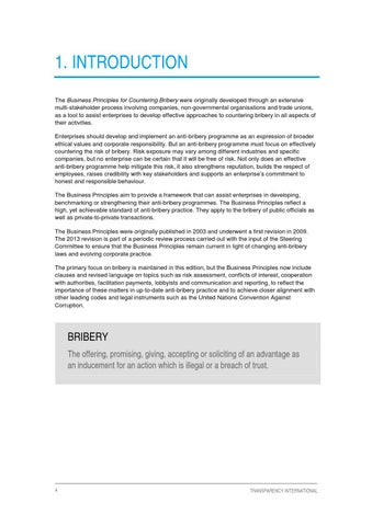 1. INTRODUCTION The Business Principles for Countering Bribery were originally developed through an extensive multi-stakeholder process involving companies, non-governmental organisations and trade unions, as a tool to assist enterprises to develop effective approaches to countering bribery in all aspects of their activities. Enterprises should develop and implement an anti-bribery programme as an expression of broader ethical values and corporate responsibility. But an anti-bribery programme must focus on effectively countering the risk of bribery. Risk exposure may vary among different industries and specific companies, but no enterprise can be certain that it will be free of risk. Not only does an effective anti-bribery programme help mitigate this risk, it also strengthens reputation, builds the respect of employees, raises credibility with key stakeholders and supports an enterprise’s commitment to honest and responsible behaviour. The Business Principles aim to provide a framework that can assist enterprises in developing, benchmarking or strengthening their anti-bribery programmes. The Business Principles reflect a high, yet achievable standard of anti-bribery practice. They apply to the bribery of public officials as well as private-to-private transactions. The Business Principles were originally published in 2003 and underwent a first revision in 2009. The 2013 revision is part of a periodic review process carried out with the input of the Steering Committee to ensure that the Business Principles remain current in light of changing anti-bribery laws and evolving corporate practice. The primary focus on bribery is maintained in this edition, but the Business Principles now include clauses and revised language on topics such as risk assessment, conflicts of interest, cooperation with authorities, facilitation payments, lobbyists and communication and reporting, to reflect the importance of these matters in up-to-date anti-bribery practice and to achieve closer alignment with other leading codes and legal instruments such as the United Nations Convention Against Corruption.