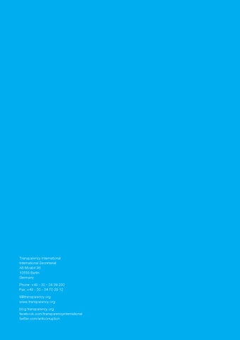 Transparency International International Secretariat Alt-Moabit 96 10559 Berlin Germany Phone: +49 - 30 - 34 38 200 Fax: +49 - 30 - 34 70 39 12 ti@transparency.org www.transparency.org blog.transparency.org facebook.com/transparencyinternational twitter.com/anticorruption