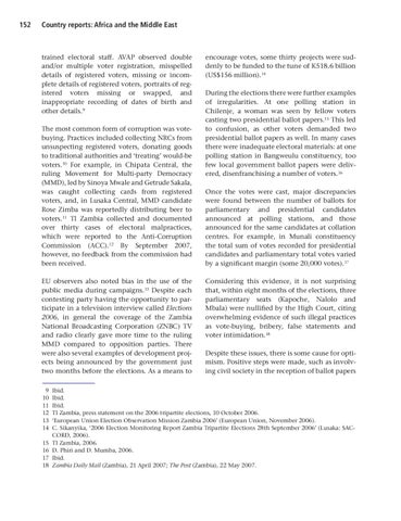Ibid. Ibid. Ibid. TI Zambia, press statement on the 2006 tripartite elections, 10 October 2006. ‘European Union Election Observation Mission Zambia 2006’ (European Union, November 2006). C. Sikanyika, ‘2006 Election Monitoring Report Zambia Tripartite Elections 28th September 2006’ (Lusaka: SACCORD, 2006). TI Zambia, 2006. D. Phiri and D. Mumba, 2006. Ibid. Zambia Daily Mail (Zambia), 21 April 2007; The Post (Zambia), 22 May 2007.
