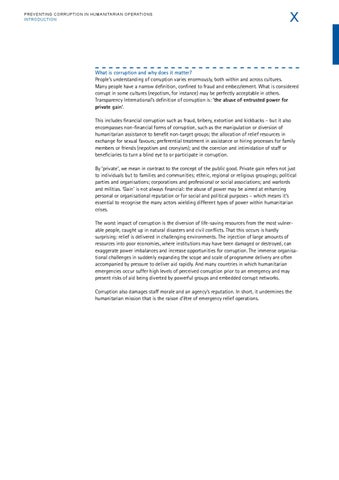 What is corruption and why does it matter? People’s understanding of corruption varies enormously, both within and across cultures. Many people have a narrow definition, confined to fraud and embezzlement. What is considered corrupt in some cultures (nepotism, for instance) may be perfectly acceptable in others. Transparency International’s definition of corruption is: ‘the abuse of entrusted power for private gain’. This includes financial corruption such as fraud, bribery, extortion and kickbacks – but it also encompasses non-financial forms of corruption, such as the manipulation or diversion of humanitarian assistance to benefit non-target groups; the allocation of relief resources in exchange for sexual favours; preferential treatment in assistance or hiring processes for family members or friends (nepotism and cronyism); and the coercion and intimidation of staff or beneficiaries to turn a blind eye to or participate in corruption. By ‘private’, we mean in contrast to the concept of the public good. Private gain refers not just to individuals but to families and communities; ethnic, regional or religious groupings; political parties and organisations; corporations and professional or social associations; and warlords and militias. ‘Gain’ is not always financial: the abuse of power may be aimed at enhancing personal or organisational reputation or for social and political purposes – which means it’s essential to recognise the many actors wielding different types of power within humanitarian crises. The worst impact of corruption is the diversion of life-saving resources from the most vulnerable people, caught up in natural disasters and civil conflicts. That this occurs is hardly surprising: relief is delivered in challenging environments. The injection of large amounts of resources into poor economies, where institutions may have been damaged or destroyed, can exaggerate power imbalances and increase opportunities for corruption. The immense organisational challenges in suddenly expanding the scope and scale of programme delivery are often accompanied by pressure to deliver aid rapidly. And many countries in which humanitarian emergencies occur suffer high levels of perceived corruption prior to an emergency and may present risks of aid being diverted by powerful groups and embedded corrupt networks. Corruption also damages staff morale and an agency’s reputation. In short, it undermines the humanitarian mission that is the raison d’être of emergency relief operations.