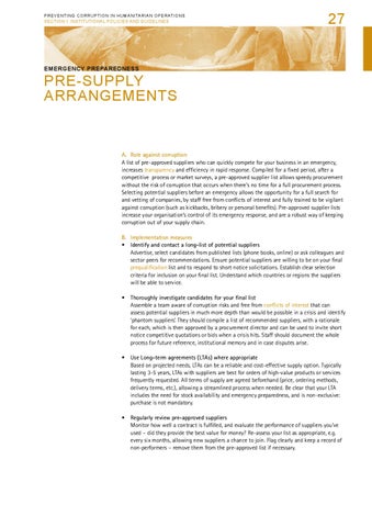 A. Role against corruption A list of pre-approved suppliers who can quickly compete for your business in an emergency, increases transparency and efficiency in rapid response. Compiled for a fixed period, after a competitive process or market surveys, a pre-approved supplier list allows speedy procurement without the risk of corruption that occurs when there’s no time for a full procurement process. Selecting potential suppliers before an emergency allows the opportunity for a full search for and vetting of companies, by staff free from conflicts of interest and fully trained to be vigilant against corruption (such as kickbacks, bribery or personal benefits). Pre-approved supplier lists increase your organisation’s control of its emergency response, and are a robust way of keeping corruption out of your supply chain. B. Implementation measures • Identify and contact a long-list of potential suppliers Advertise, select candidates from published lists (phone books, online) or ask colleagues and sector peers for recommendations. Ensure potential suppliers are willing to be on your final prequalification list and to respond to short notice solicitations. Establish clear selection criteria for inclusion on your final list. Understand which countries or regions the suppliers will be able to service. • Thoroughly investigate candidates for your final list Assemble a team aware of corruption risks and free from conflicts of interest that can assess potential suppliers in much more depth than would be possible in a crisis and identify ‘phantom suppliers’. They should compile a list of recommended suppliers, with a rationale for each, which is then approved by a procurement director and can be used to invite short notice competitive quotations or bids when a crisis hits. Staff should document the whole process for future reference, institutional memory and in case disputes arise. • Use Long-term agreements (LTAs) where appropriate Based on projected needs, LTAs can be a reliable and cost-effective supply option. Typically lasting 3-5 years, LTAs with suppliers are best for orders of high-value products or services frequently requested. All terms of supply are agreed beforehand (price, ordering methods, delivery terms, etc.), allowing a streamlined process when needed. Be clear that your LTA includes the need for stock availability and emergency preparedness, and is non-exclusive: purchase is not mandatory. • Regularly review pre-approved suppliers Monitor how well a contract is fulfilled, and evaluate the performance of suppliers you’ve used – did they provide the best value for money? Re-assess your list as appropriate, e.g. every six months, allowing new suppliers a chance to join. Flag clearly and keep a record of non-performers – remove them from the pre-approved list if necessary.