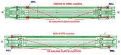 The re-railing plates on a Class 397 are located as shown. During the re-railing of a CAF unit the solebar suffered extensive damage as shown and required significant rectification before return to service. The re-railing plates on a Class 397 are an identical design at the intermediate end but differ slightly at the cab ends. The two different types are secured to the unit differently as shown. Whilst the jacking pad design is considered compliant to standards CAF recognise that rerailing activities can differ. The location and type of derailment determine the level of additional load that can be applied to the jacking pad. Therefore, following a request from the unit owners, CAF propose to improve the design of the jacking pads for the Class 397s to a more robust solution as shown. The jacking pads will be secured using the same fixing arrangements as the existing jacking pads.