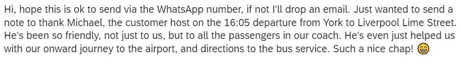 We also have an example of a colleague going the extra mile to help a vulnerable teenager who was on his train.