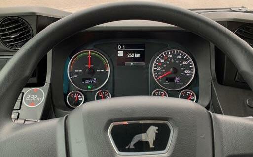 Ved afgangen fra Tilst viste instrumenterne, at vi kunne køre 252 kilometer. Læg mærke til, at den traditionelle omdrejningstæller er skiftet ud med en “tæller”, der viser energiforbruget - og dermed ogs fortæller lidt om det aktuelle moment i el-motoren. Lidt ligesom en omdrejningstæller, når man kender motorens momentkurve.Magasinet Bus 11- 2020