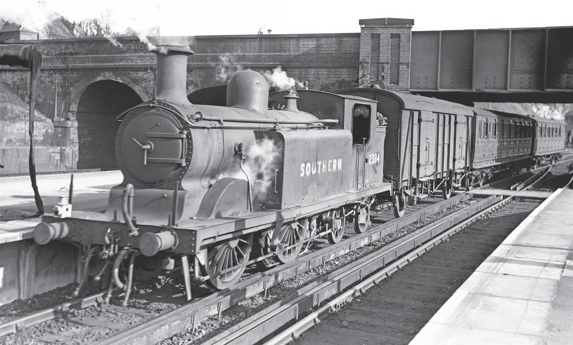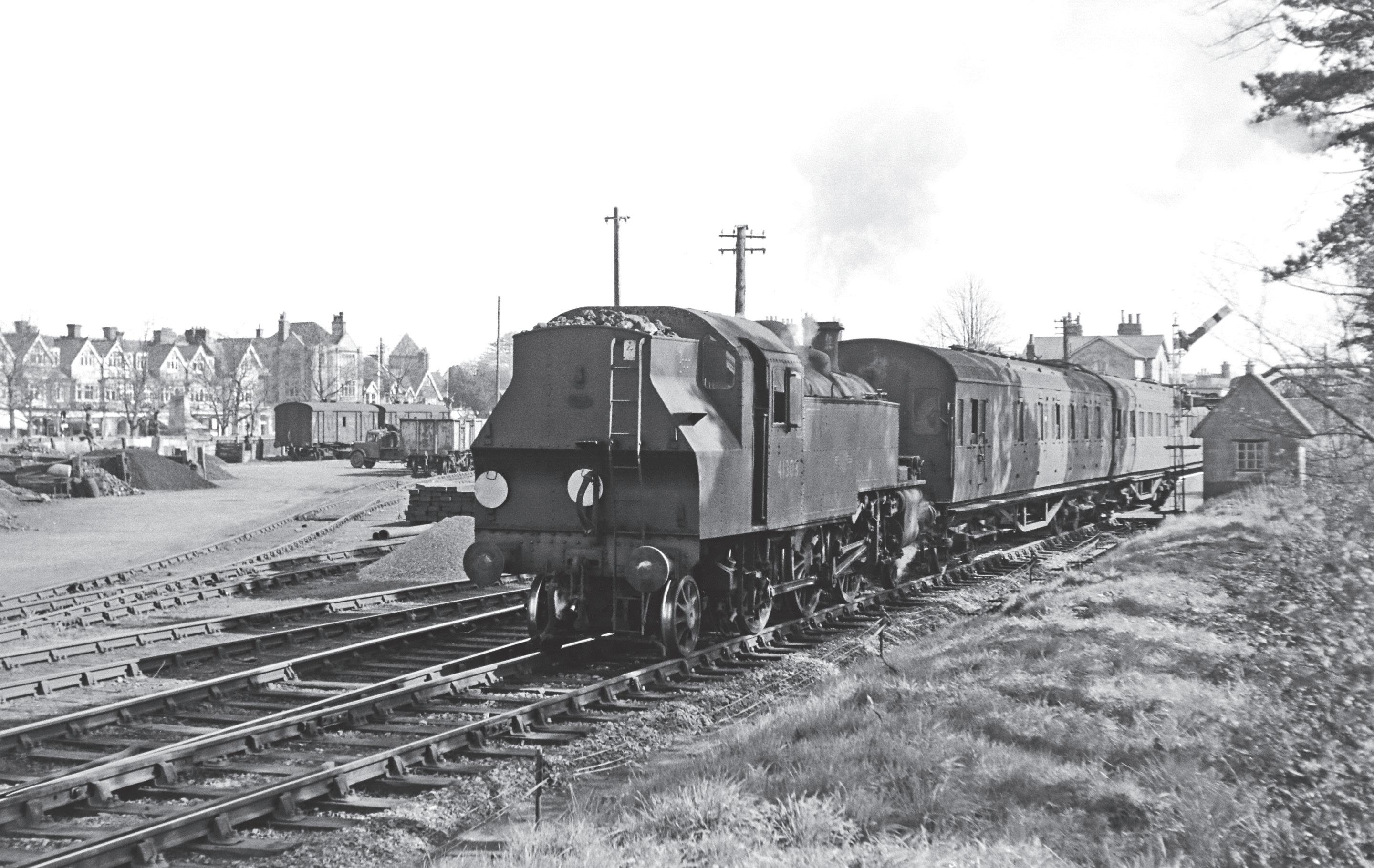 We turn the clock back a few years for the next selection of images, beginning with this shot of D3 class No. 2384 in Southern livery heading up the 5pm service to Horsham, which it is propelling out of Guildford station under Farnham Road bridge on 14 April 1949. These tanks performed regularly over the branches from Horsham for many years after the Grouping with the last example, No. 32390, not being withdrawn until October 1955. (Peter Pescod)